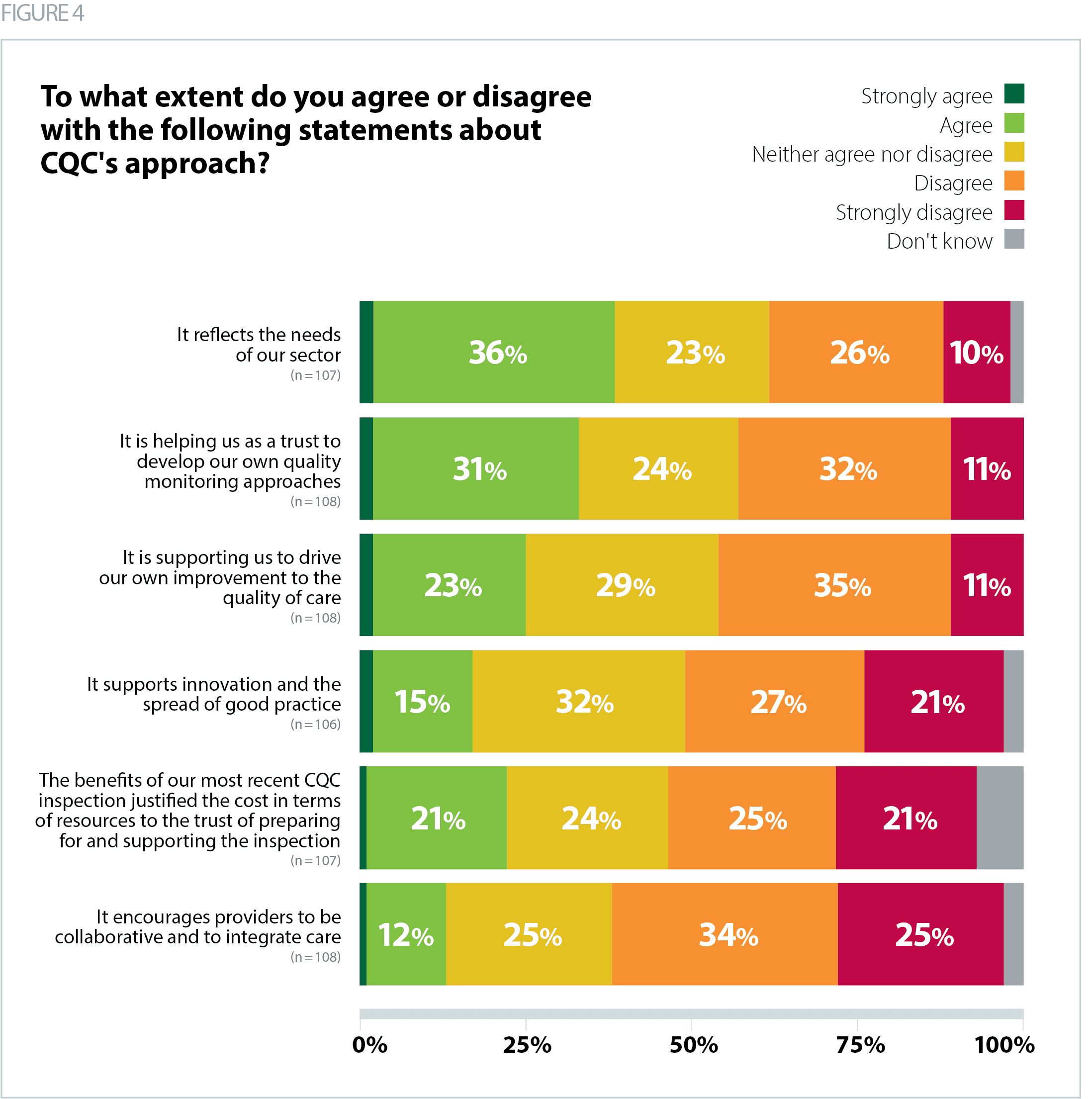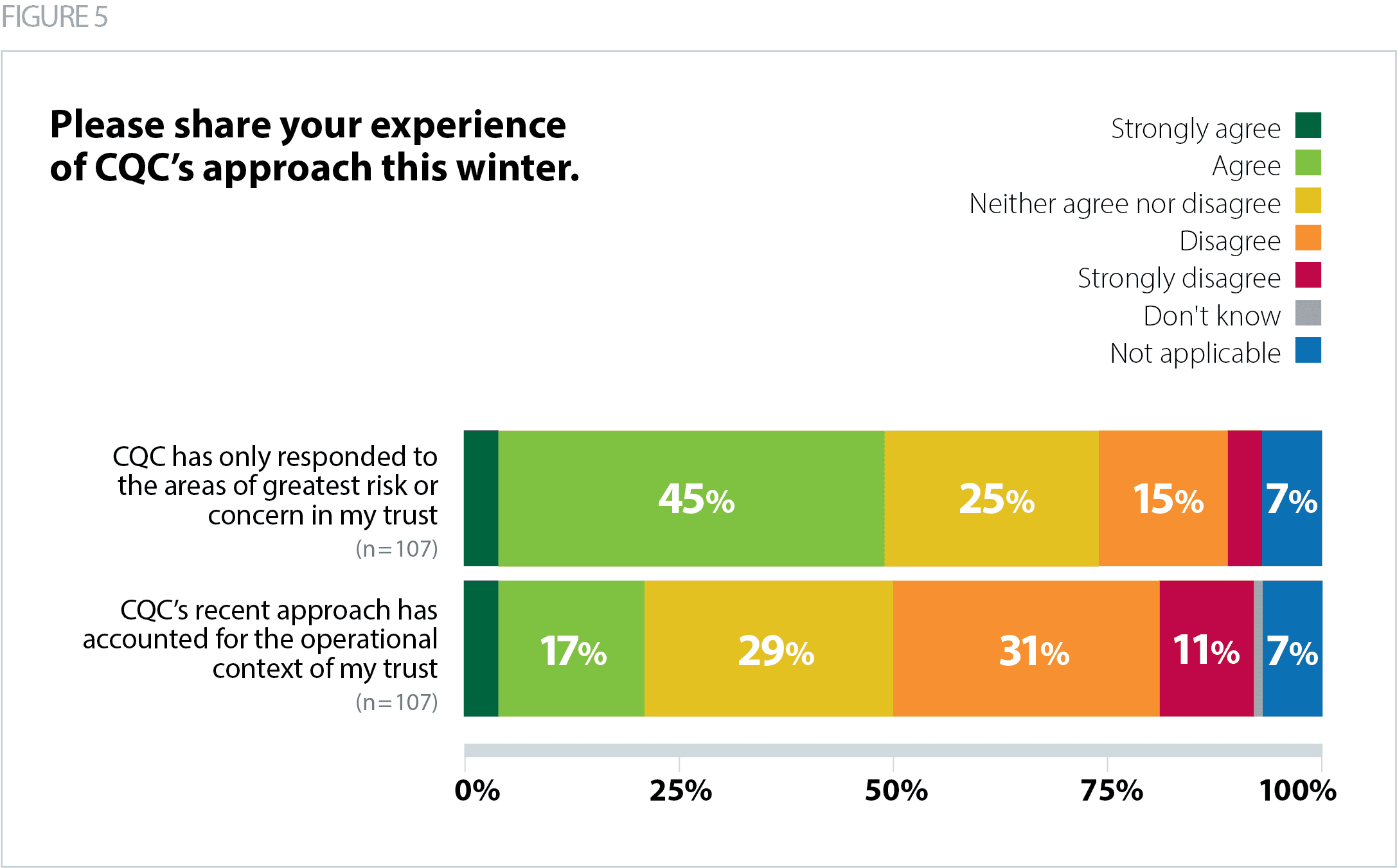 - 21% agreed or strongly agreed that CQC’s recent approach has accounted for the operational context of their trust, down from 29% last year.