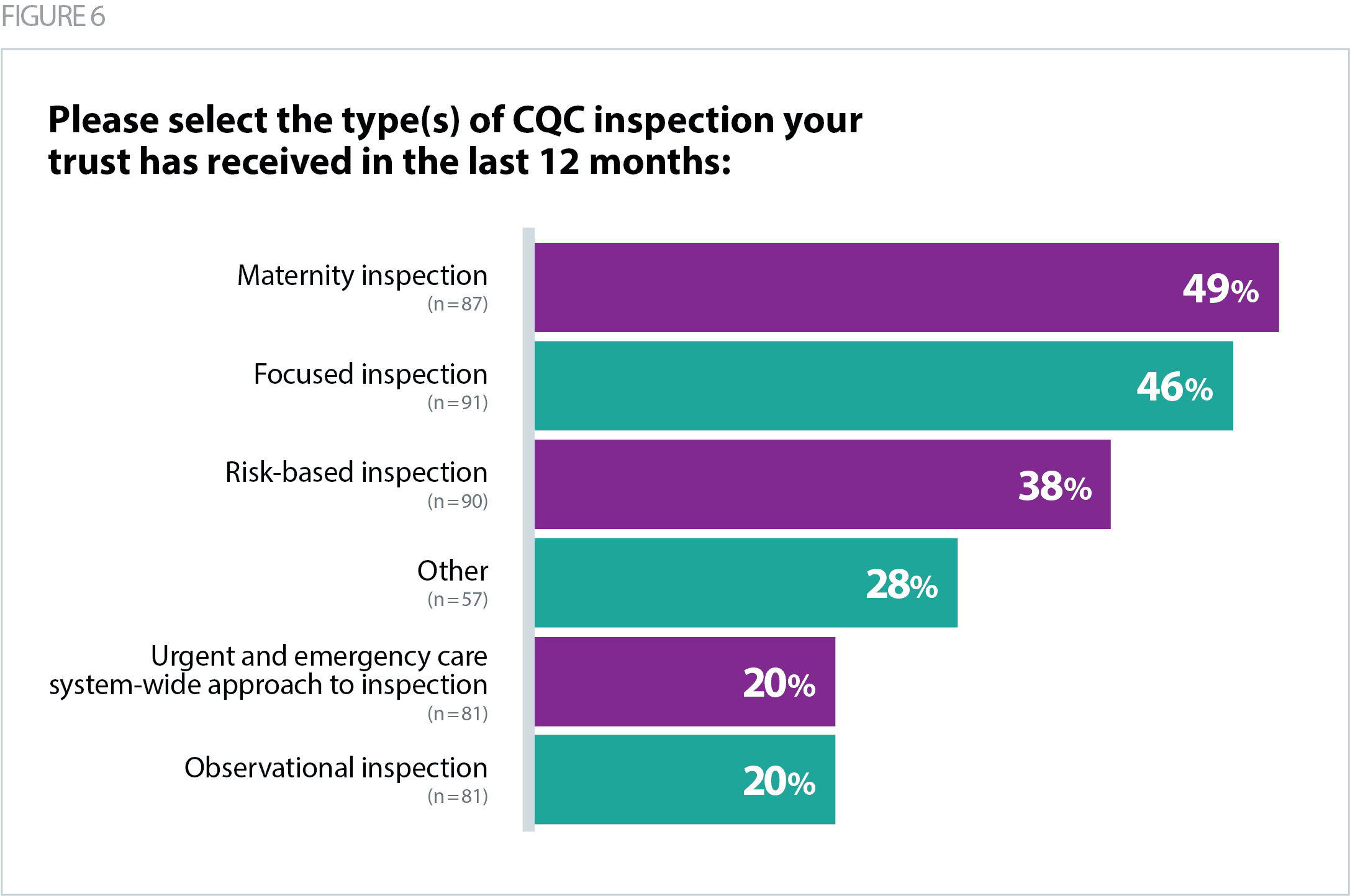 In consultation with CQC, we identified the most common inspection types that CQC had undertaken in the past year, as these differed from previous years. Figure 6 below shows that just under half of respondents (49%) have experienced a maternity inspection in the past year[1], compared with 35% last year, demonstrating the increased national and CQC focus on maternity.