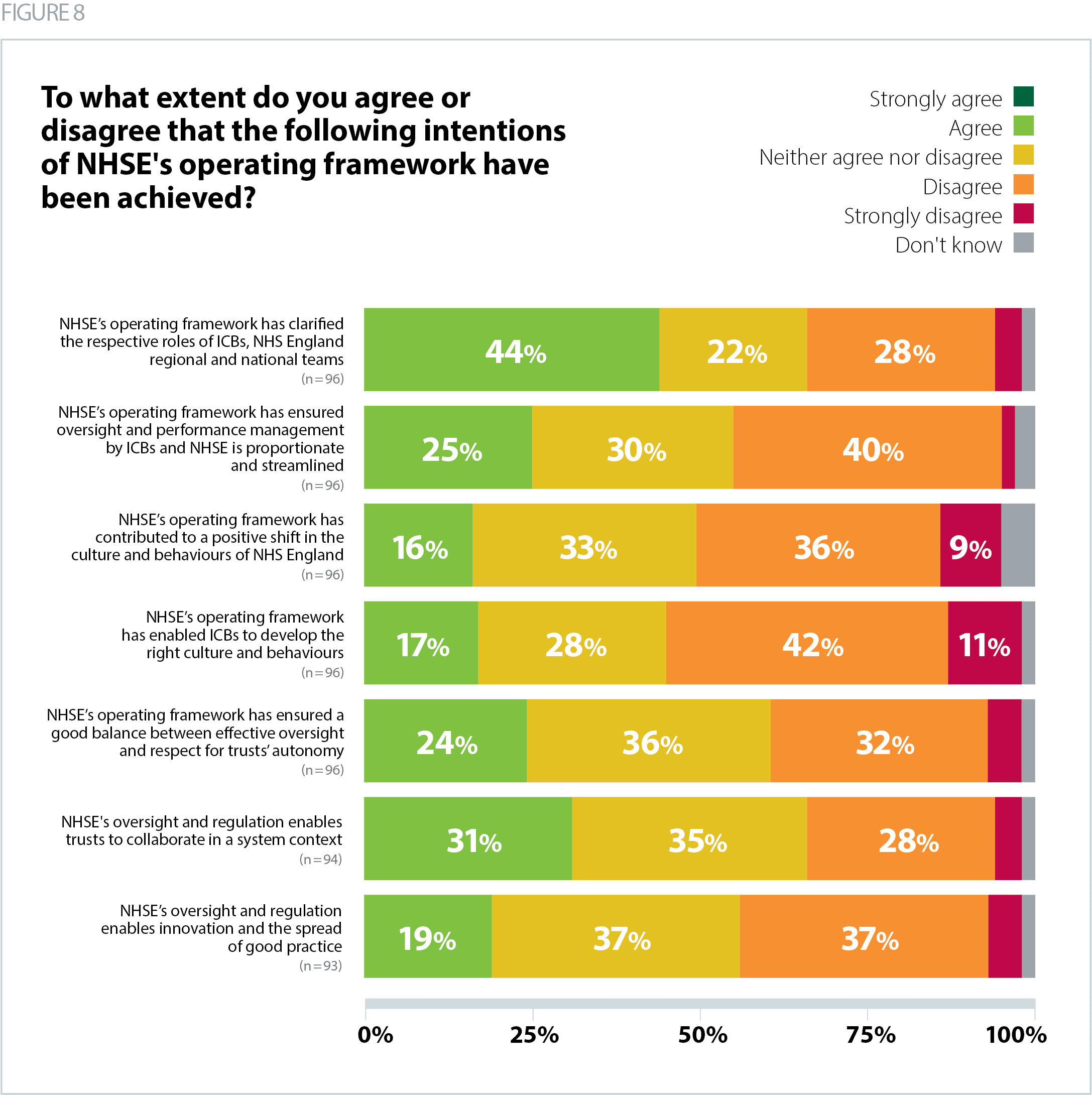 - This year 44% of respondents agreed that NHSE’s operating framework has clarified the respective roles of ICBs, and NHSE regional and national teams. This is up from 32% agreeing or strongly agreeing last year.