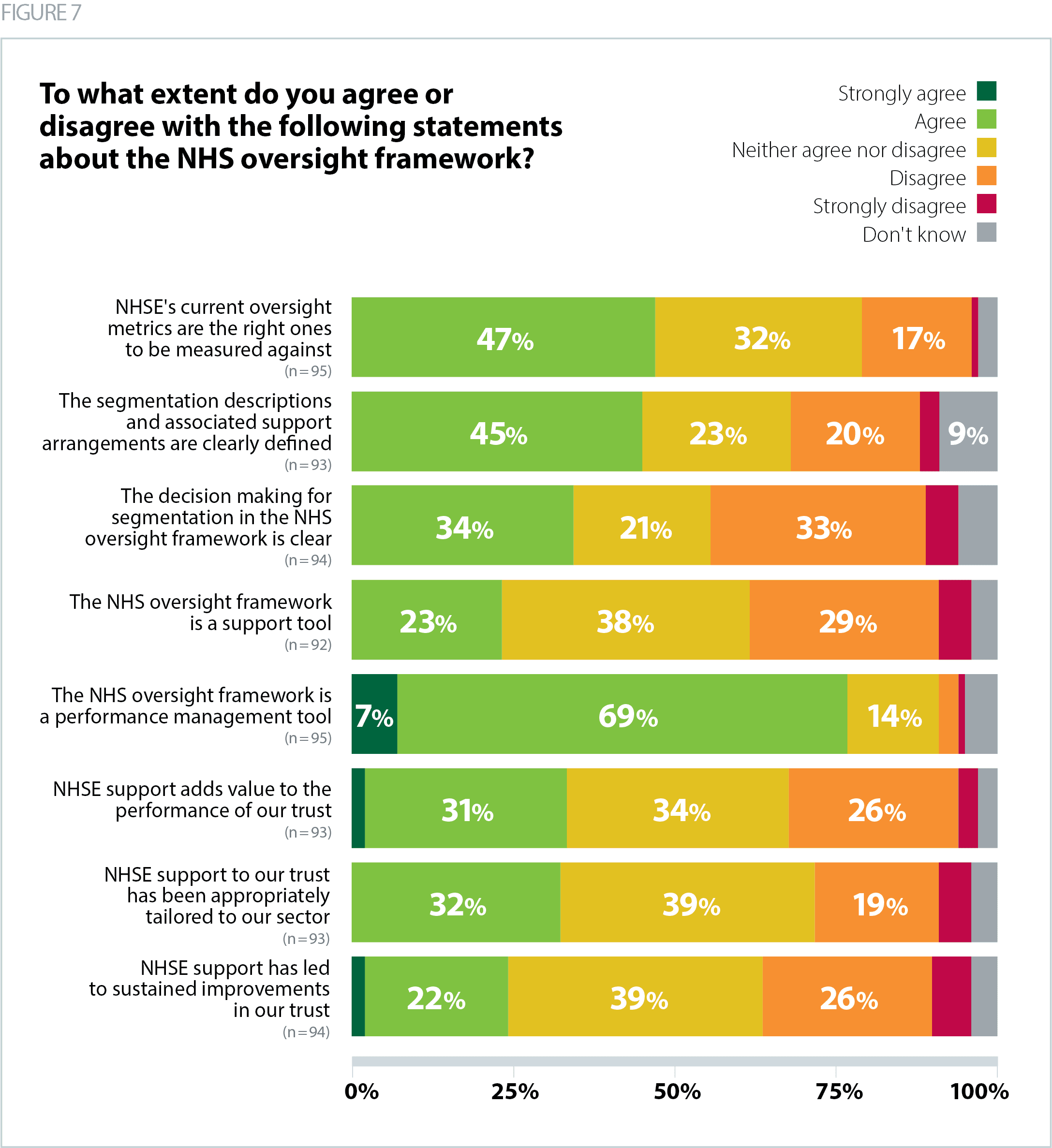 - Under half (47%) of respondents agreed that NHSE’s oversight metrics were the right ones to be measured against, which is down from 56% agreeing or strongly agreeing last year.