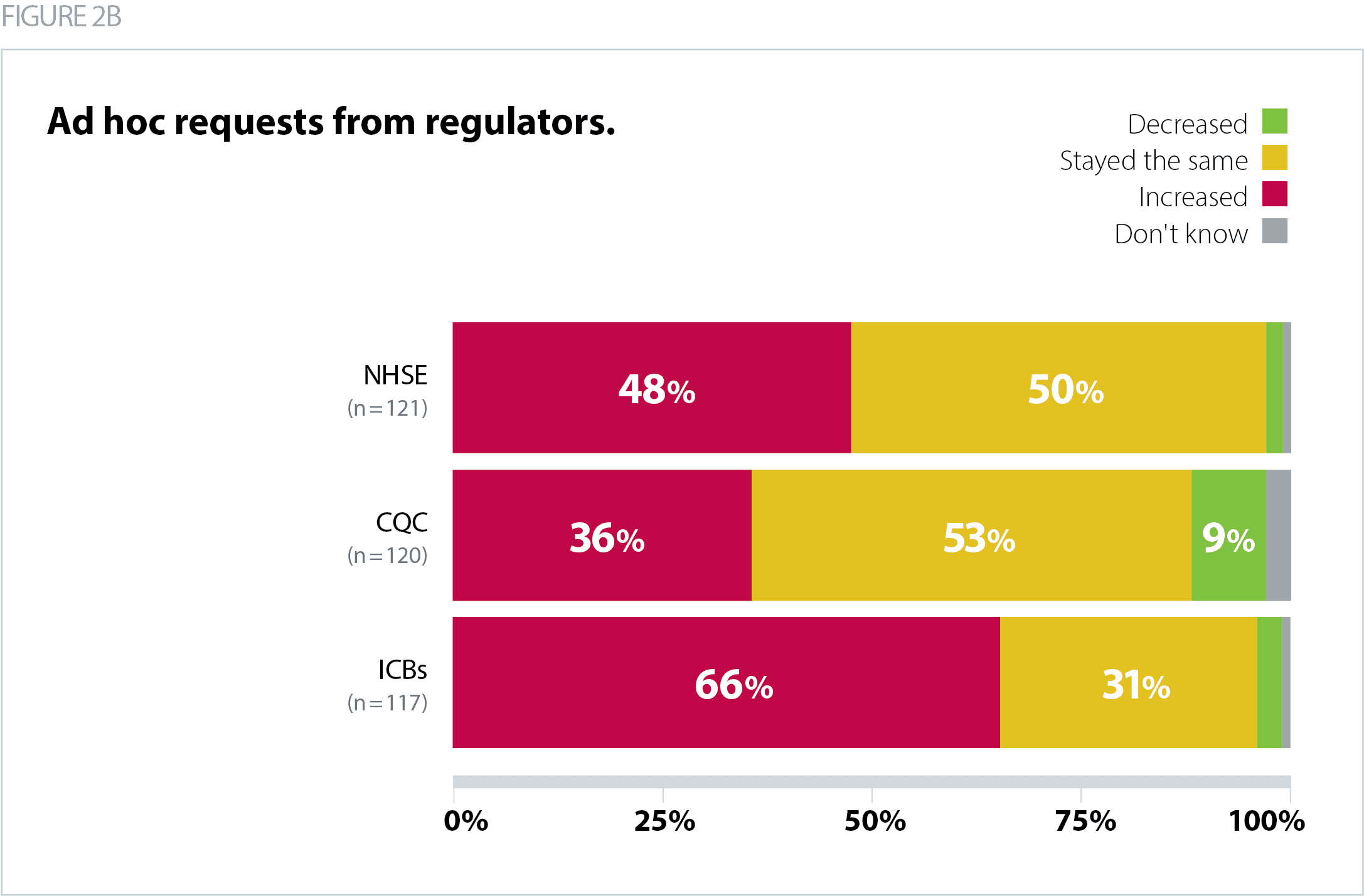 Two-thirds of respondents (66%) said that ad hoc requests coming from ICBs had increased, compared to 48% in relation to NHSE and 36% in relation to CQC.