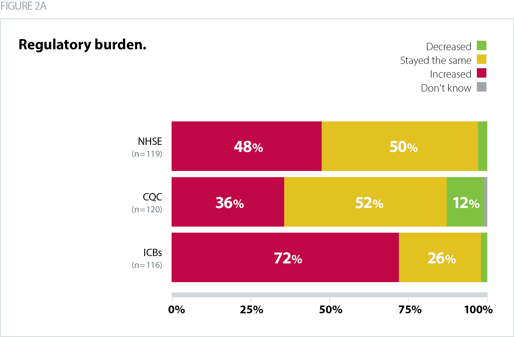 Respondents were much more likely to say that the burden of regulation and the ad hoc requests coming from ICBs have increased, compared to those coming from CQC and NHSE. Almost three-quarters (72%) said the burden of regulation coming from ICBs had risen, while more said the burden from NHSE and CQC had stayed the same rather than increased.