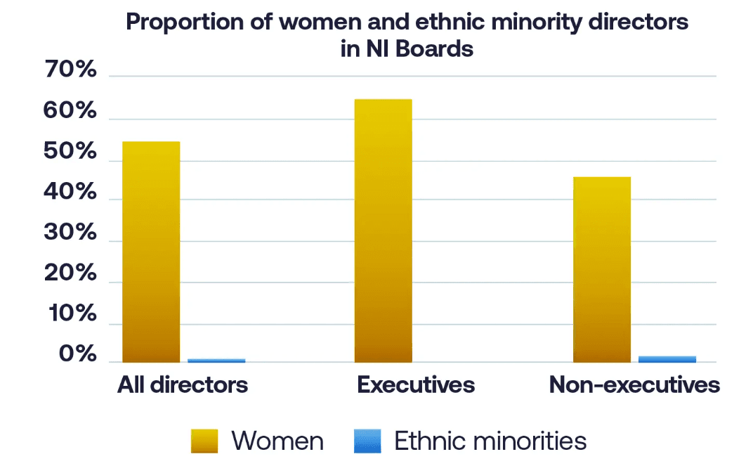 In Northern Ireland, although at a national level, figures for board directors are gender balanced, only two of the eight boards hit the EC definition. The remaining six are split evenly between having excess men and excess women. Seven of the eight boards are entirely white.