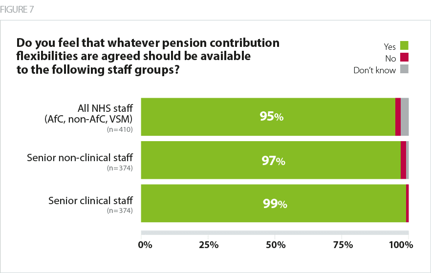 Respondents were almost unanimous in the view that senior non-clinical staff should be eligible for pension contribution flexibilities (97%). Almost as many (95%) felt that the flexibilities should be available to all NHS staff including AfC, VSM and other non-AfC staff groups.