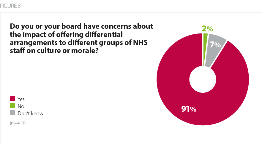 Respondents were also unequivocal in their concern at the equity implications of offering pensions flexibilities only to clinicians in active clinical roles, particularly for its impact on culture and morale across the workforce. Nine in ten respondents (91%) said that they or their boards are concerned about the impact on culture and morale of offering differential arrangements to different groups of staff.
