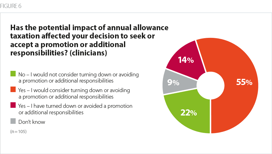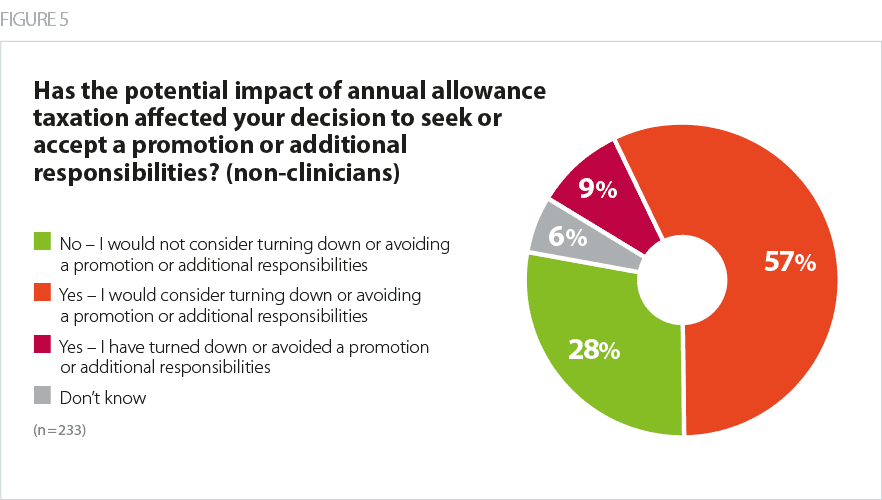 In the absence of a clear understanding of which circumstances might lead to a tax bill, there is evidence that NHS staff are becoming risk averse about taking on more responsibilities or accepting promotions, as they struggle to predict whether a pay rise may affect their pension. This is coupled with a perception that the incentive to pursue more senior roles is diminished in light of tax arrangements which threaten to eat into the overall reward package of taking on executive posts.
