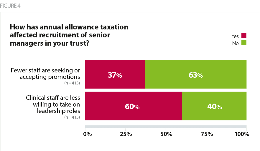 Trust leaders have concerns about the future pipeline of staff to fill vacancies in senior posts, given the impact of pay rises on potential tax liabilities, with 37% of directors saying that fewer staff are seeking or accepting promotions and 60% seeing clinical staff become less willing to take on leadership roles. This is likely to be impacted by the fact that taking on a leadership role now carries the risk of senior clinicians’ forfeiting their eligibility for proposed pension flexibilities, based on the extent to which the role retains 'clinical duties'.