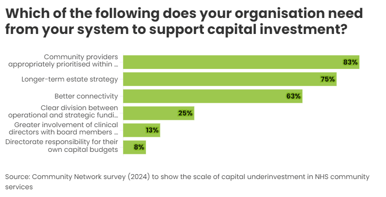 Respondents to our survey wanted to see community providers appropriately prioritised within system-level capital planning (83%), a longer-term estate strategy at system level (75%), and better connectivity with primary care and local authorities (62%). Prioritisation and long-term planning are key priorities for the sector at both a national and local level.