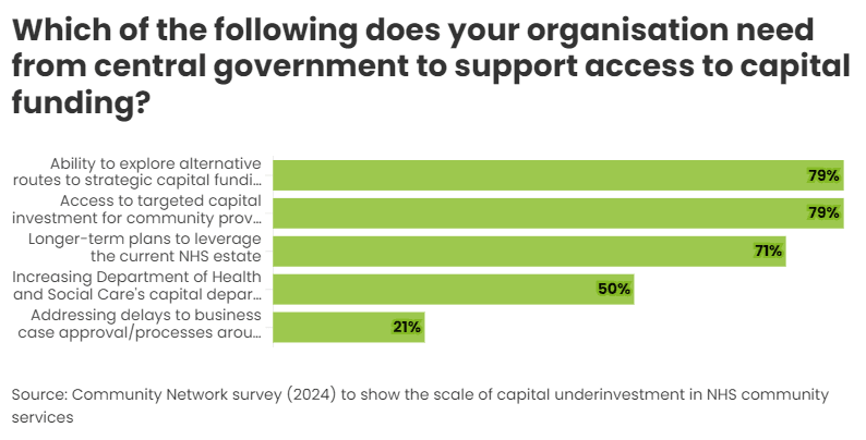 When asked about what their organisation needed from government to support access to capital funding, the most common answers were: ability to explore alternative routes to strategic capital funding (78%), access to targeted capital funding for community providers (78%) and longer-term plans to leverage the NHS estate (72%).