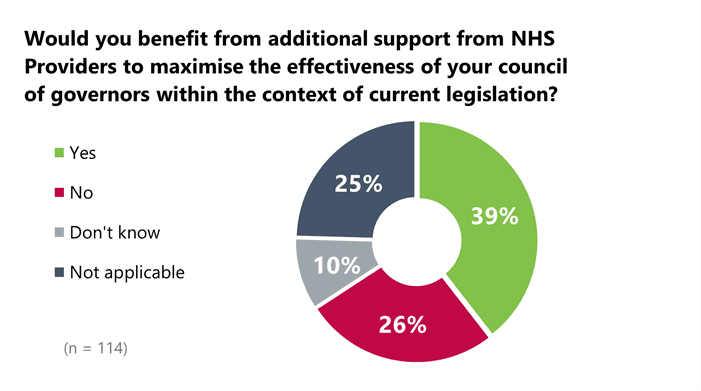 - Two in five (39%) respondents said that they would benefit from additional support to maximise the effectiveness of their council of governors, which is lower than last year (47%). Just over a quarter (26%) said that they would not, up from a fifth last year (21%) and 10% said they did not know, similar to last year (7%).