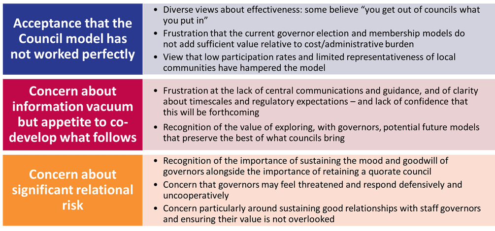 - Frame the reform as something to be shaped with governors, using the interim period to explore and pilot alternative engagement models where needed.