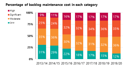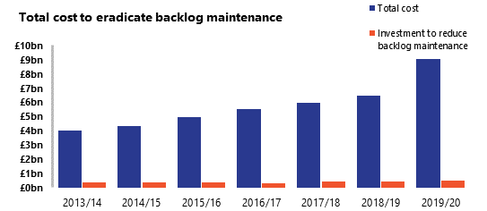 The cost of bringing deteriorating assets back to a suitable working condition – known as the maintenance backlog – continues to rise. In 2019/20 the backlog was £9bn. This represents a 40% increase from the 2018/19 figure which stood at £6.46bn, and double the level seen five years ago.