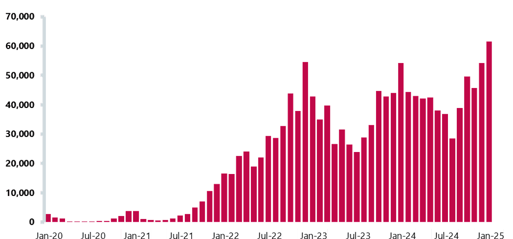 - There were a record number of patients waiting 12 hours from the decision to admit to admission this month: 61,500. This is an increase of over 7,000 from December 2024. This is 22 times greater than January 2020, before the pandemic, when only 2,846 people waited more than 12 hours to be admitted.