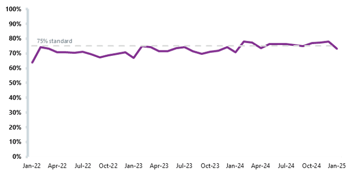 - After meeting the 28-FDS pathway standard (75%) for the last two months, performance fell short in January (73.4%) and moved further away from the upcoming March 2025 target of 77%.