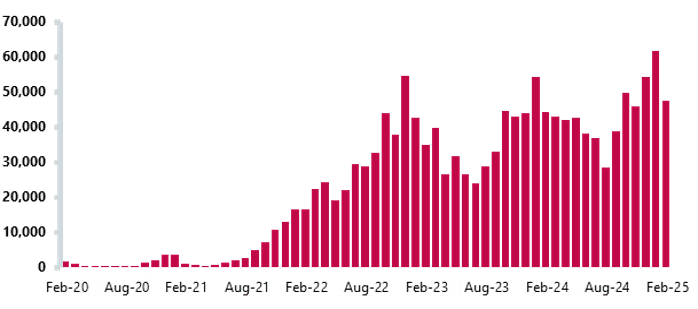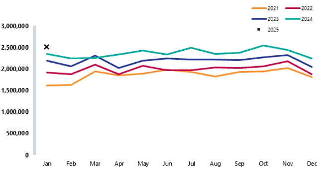 - January 2025 saw the second highest number of diagnostic tests on record: 2.51m. This is 12% more tests than last month, 7.4% more than last year and over 20% higher than pre-pandemic levels.