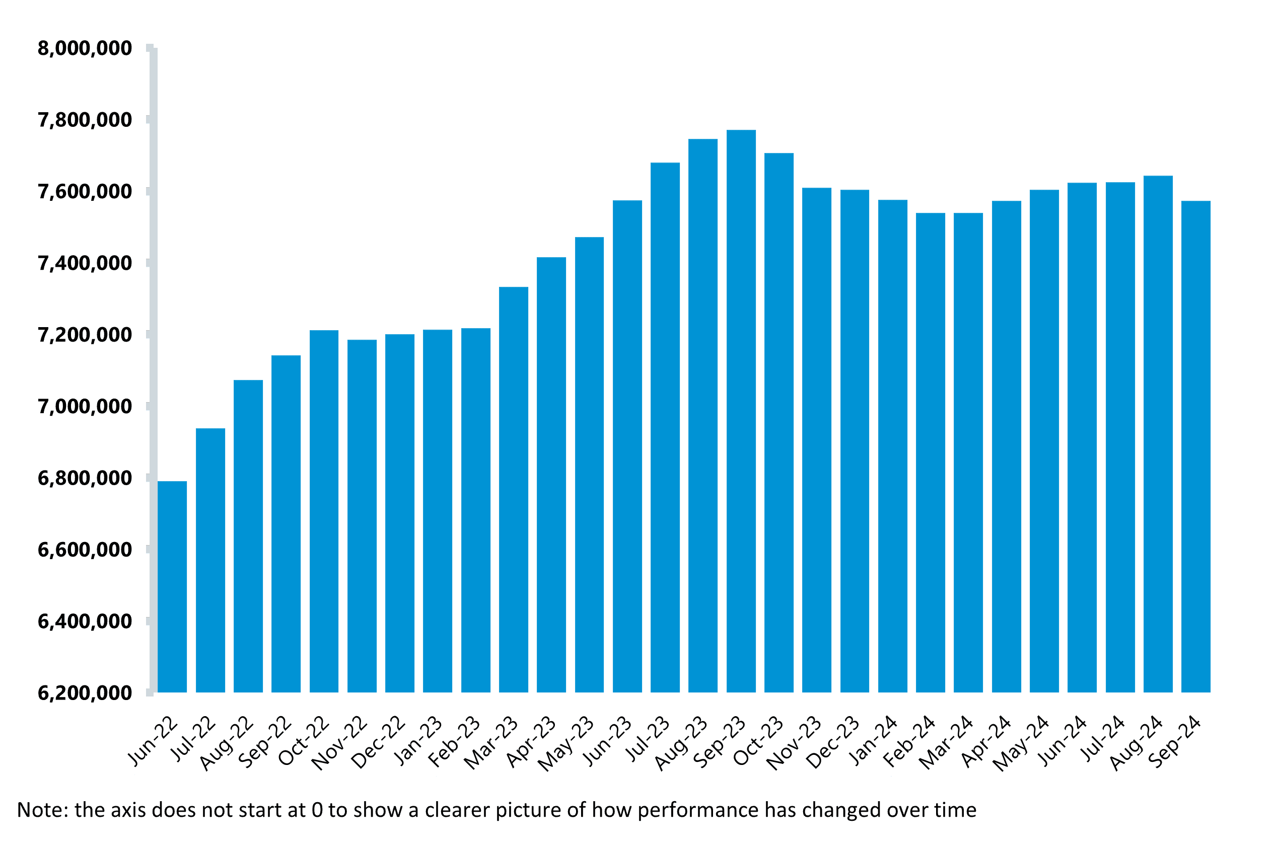 The waiting list reduced slightly to 7.57 million in September with 70,000 fewer treatments than last month. The size of the waiting list is smaller than it was a year ago but 66% greater than five years ago in September 2019, before the pandemic. In September, 83.8% of patients on the waiting list were unique patients. This is an estimated 6.34 million people, slightly lower than previous four months.