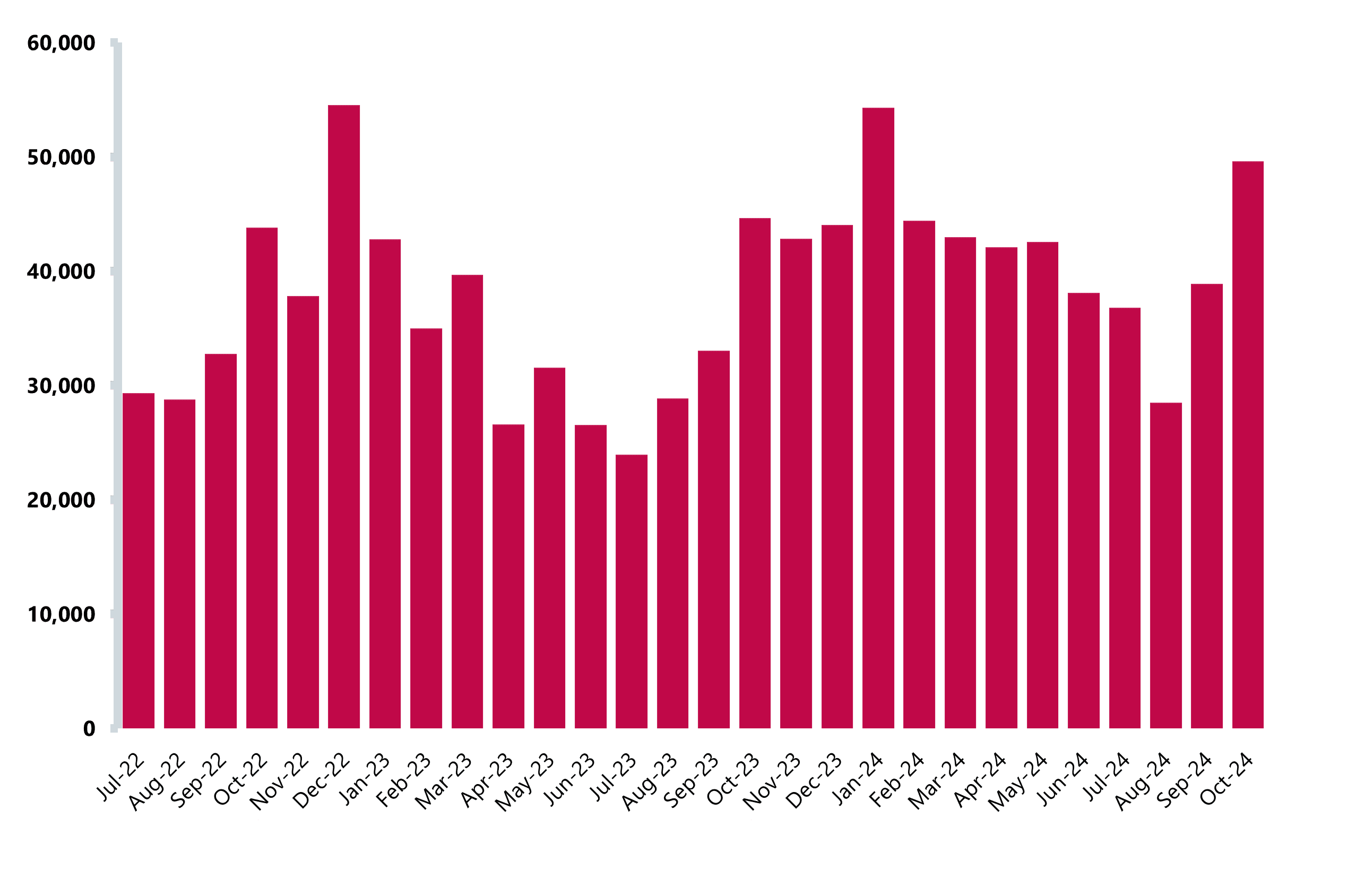 All ten months of data reported so far this year have seen record A&E attendances for that month; 2024 is on track to be the busiest year ever for A&E departments. There were 2.36 million A&E attendances in October, 6.4% more than the previous month and 6.2% higher than October last year. The difference is greatest when comparing to five years ago in October 2019, before the pandemic – we are now seeing nearly 9% more demand for services.