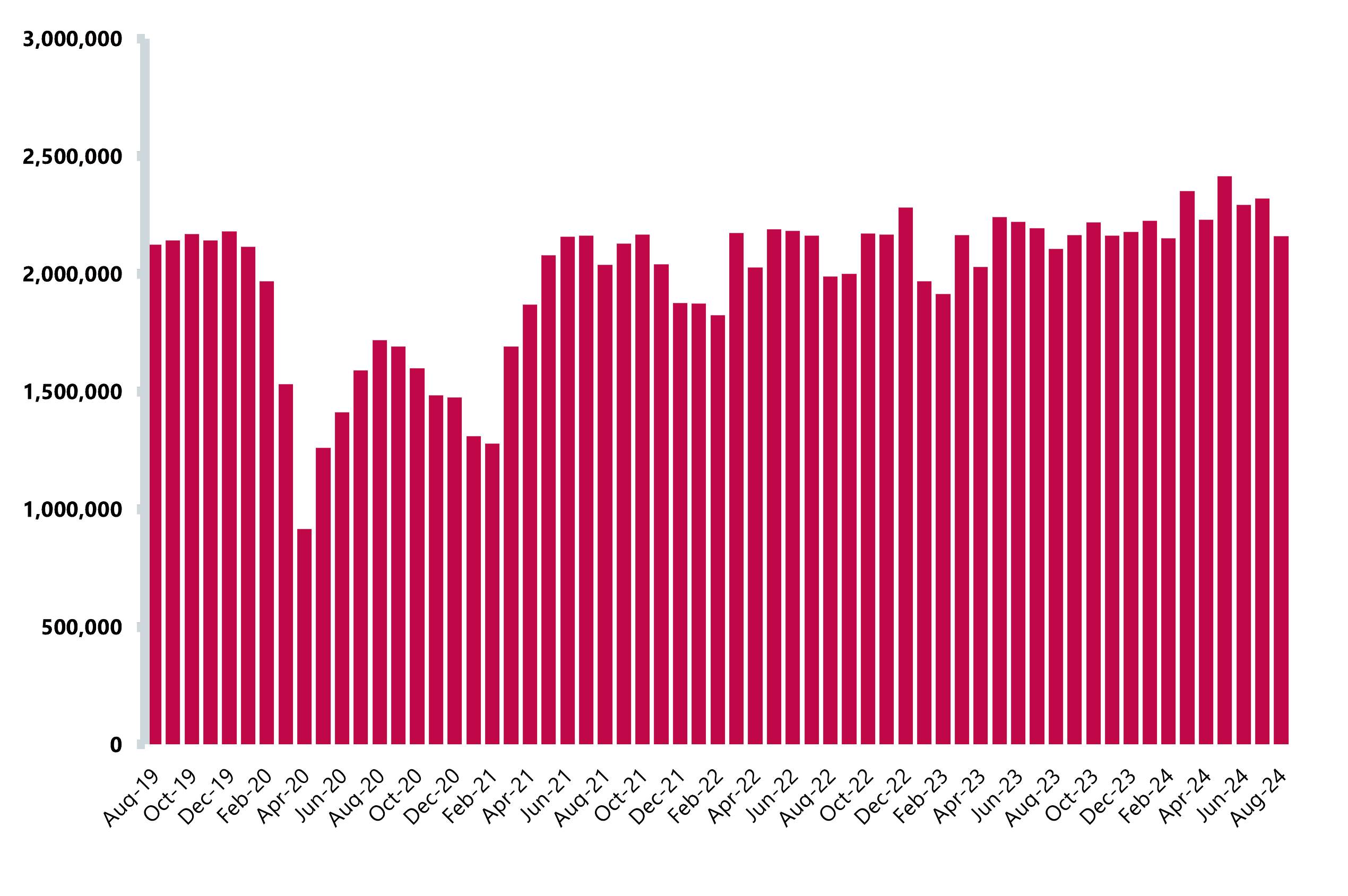 Activity across tests and screening remained high this month, with the NHS regularly delivering more tests than ever before. This is in part due to the successful roll out of community diagnostic centres. In September 2024, 2.37 million diagnostic tests were carried out. This is 1.3% higher than the month before, 7.8% higher than a year ago and over a fifth higher than pre-pandemic levels. Activity is greater than the same time last year for MRI, CT and colonoscopy scans by 10.2%, 5.9% and 3% respectively. Compared to September 2019, activity is also higher for MRI, CT and colonoscopy scans compared to before the pandemic (up by 27.3%, 36.6% and 21.2%, respectively).