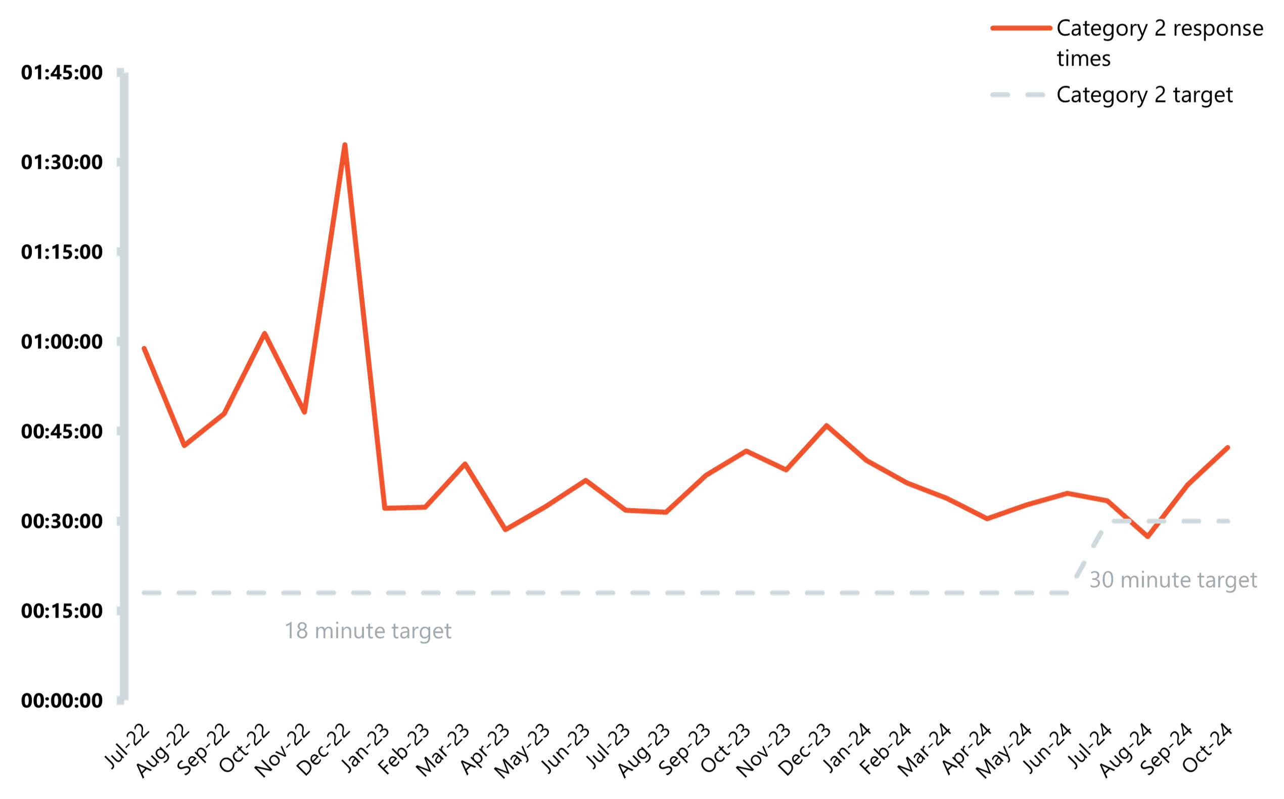 After meeting the 30-minute target for the first time this year in August 2024, response times for category 2 incidents have deteriorated over the last two months. The average response time in October reached 42 minutes 15 seconds, indicating an increase in demand for category 2 incidents. None of the regions met 30-minute category 2 target this month. However, one trust came close to meeting the 30-minute target with an average response time of 30 minutes and 9 seconds. Seven out of the 11 ambulance trusts had response times of between 30 and 40 minutes, and four trusts had response times of between 40 and 60 minutes.