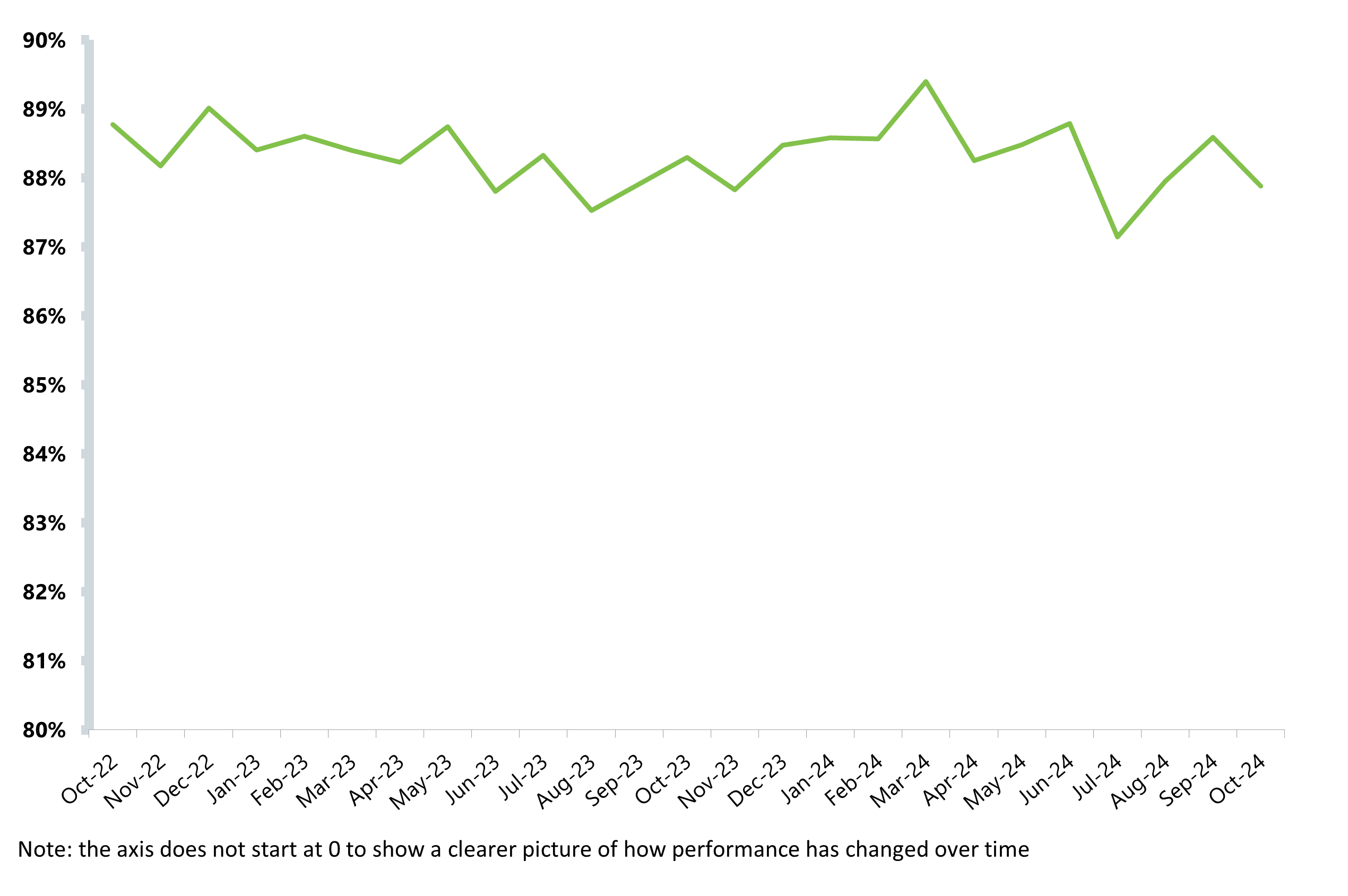 Virtual wards are a vital part of patient care which allows patients to receive the care they need at home rather than being in hospital. This helps prevent avoidable hospital admissions or supports people to safely leave hospital sooner. In October, the virtual ward capacity was 12,700, increasing by 1.2% compared to September. There were 9,900 patients in a virtual ward meaning the occupancy rate was 78.2% in October, an increase of 7.9 percentage points from 70.3% in September 2024.