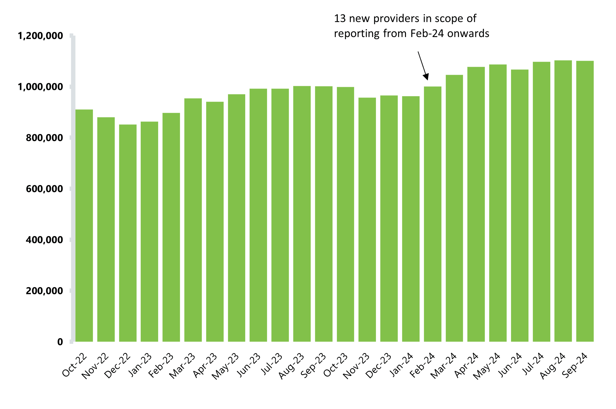 Community services waiting lists have surged over the last couple of years. There was little change in the total community health services waiting list in September: the number of people waiting fell slightly compared to last month (-1,500) to 1.10 million in September. The waiting list has stayed above 1 million for eight consecutive months since February 2024 (when 13 new providers came into scope of the community health services monthly sitrep).