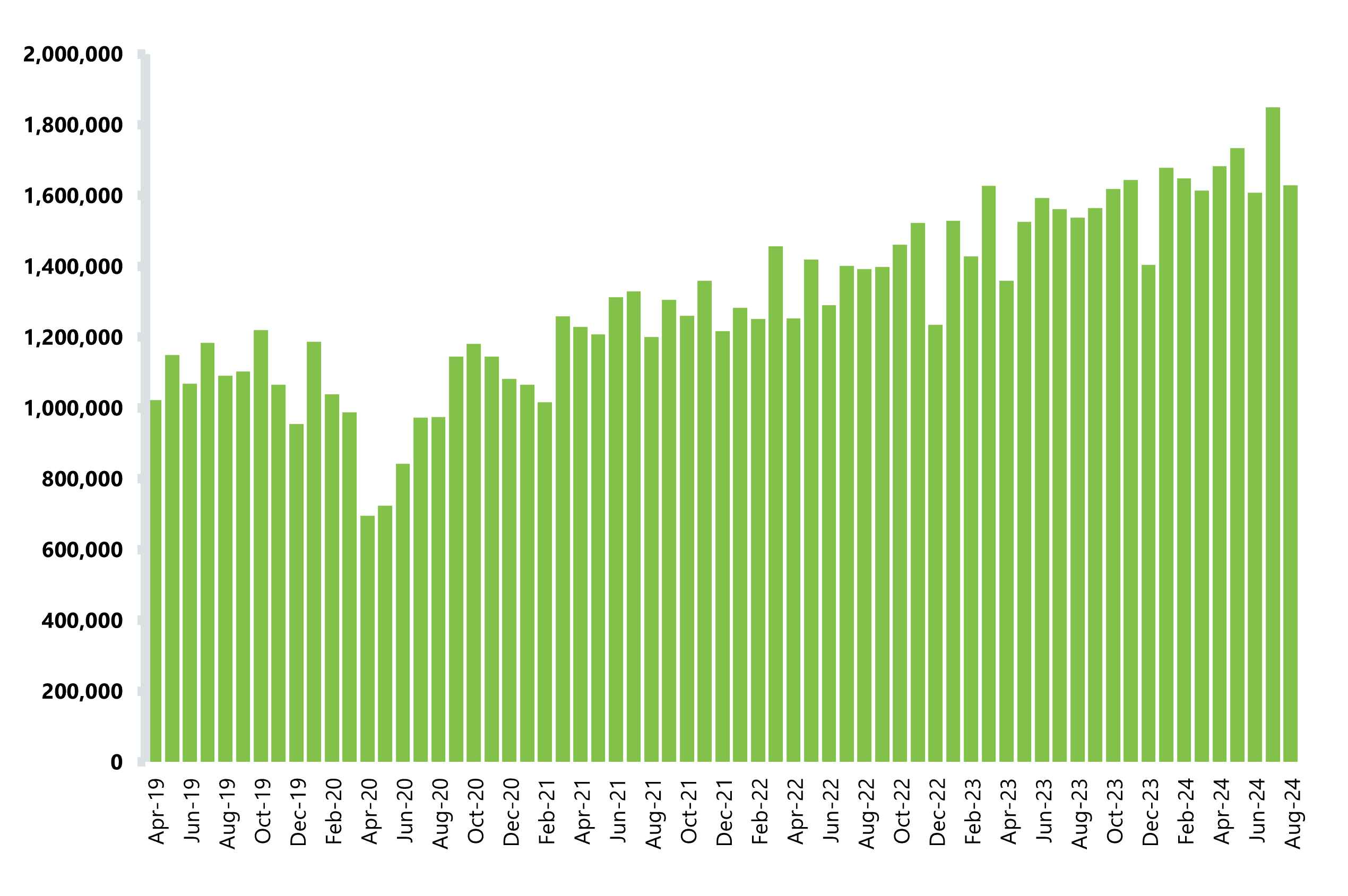 After record demand for community services in July, referrals requests fell by 12% in August to 1.63 million. However, as figure 6 shows, over the longer term, referral requests remain elevated: compared to last year referrals are up by 6% and compared to five years ago, before the pandemic, referrals are significantly higher (+49%).
