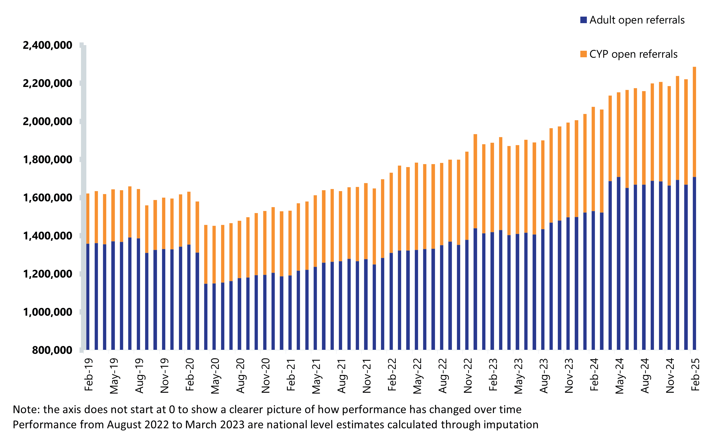 - There were a record 2.29m open referrals to mental health services in February 2025. Both adult open referrals and referrals for children and young people (CYP) reached respective record highs of 1.71m and 577,550. For adults this was 11.6% higher than last year, and for CYP, nearly 6% higher.