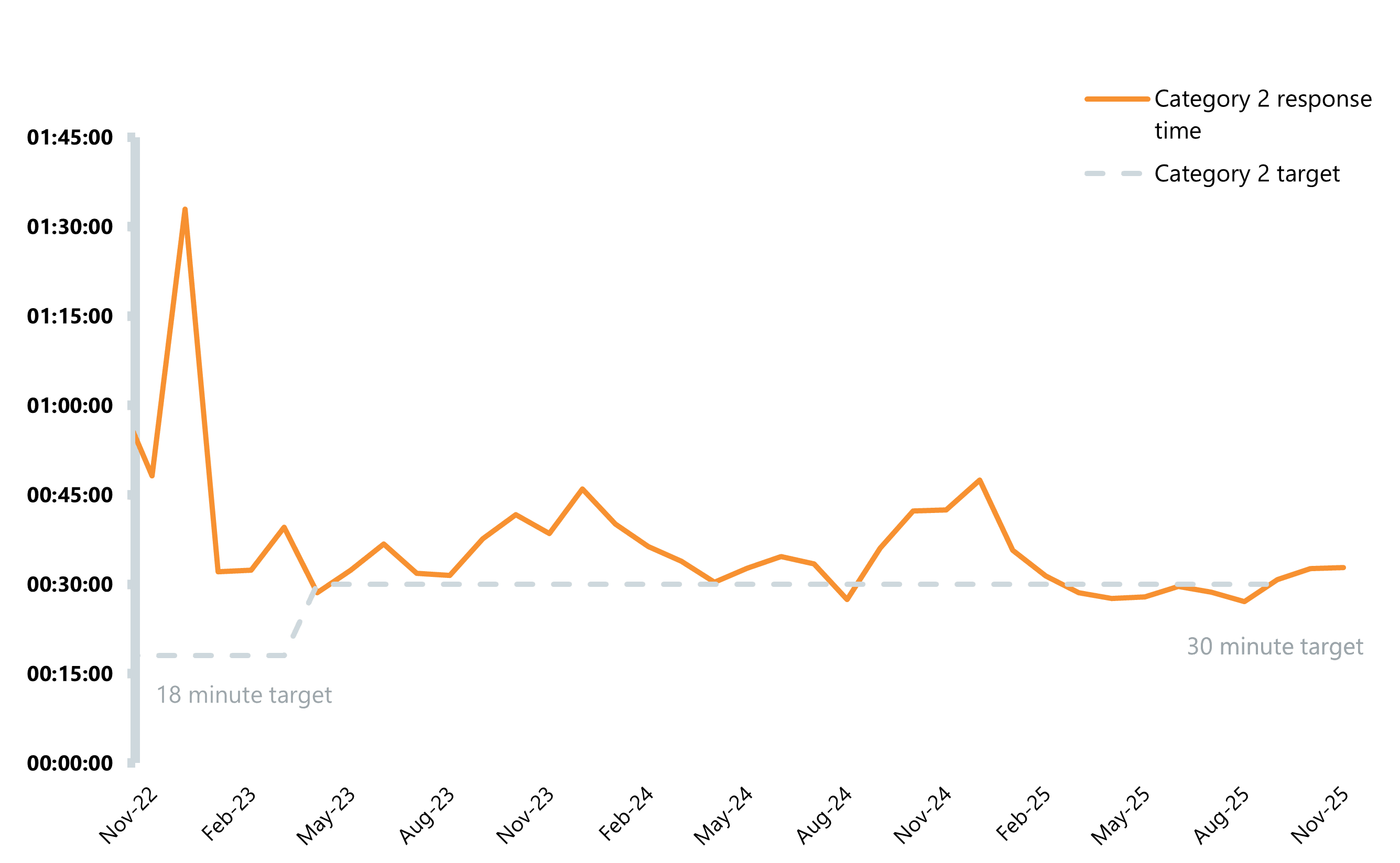 - For category 2 incidents, the average response time was 32 minutes and 46 seconds. This is almost 10 minutes faster than last November but misses the 30-minute recovery target.