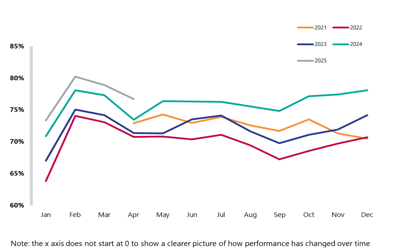 - In planned care, activity increased again across all cancer pathways, and we saw the highest April figure on record for diagnostic activity. Performance slipped back against key targets in diagnostics and cancer care, signalling ongoing delivery pressures.