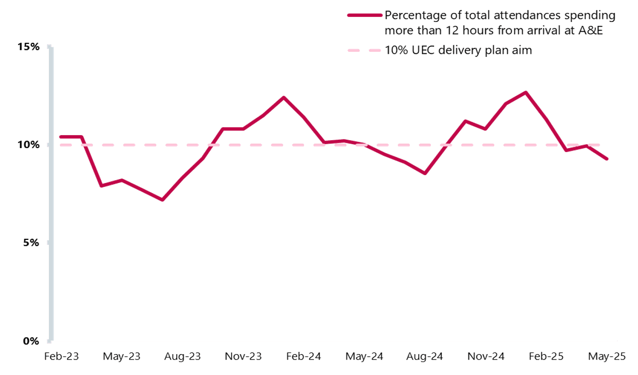 - The urgent and emergency care delivery plan outlines this as one of key areas to deliver against for winter preparedness, aiming for less than 10% of patients waiting over 12 hours in A&E. Currently waits of over 12 hours occur 9.3% of the time, but this will be a challenge to maintain over winter, based on performance in previous years (see figure 1).