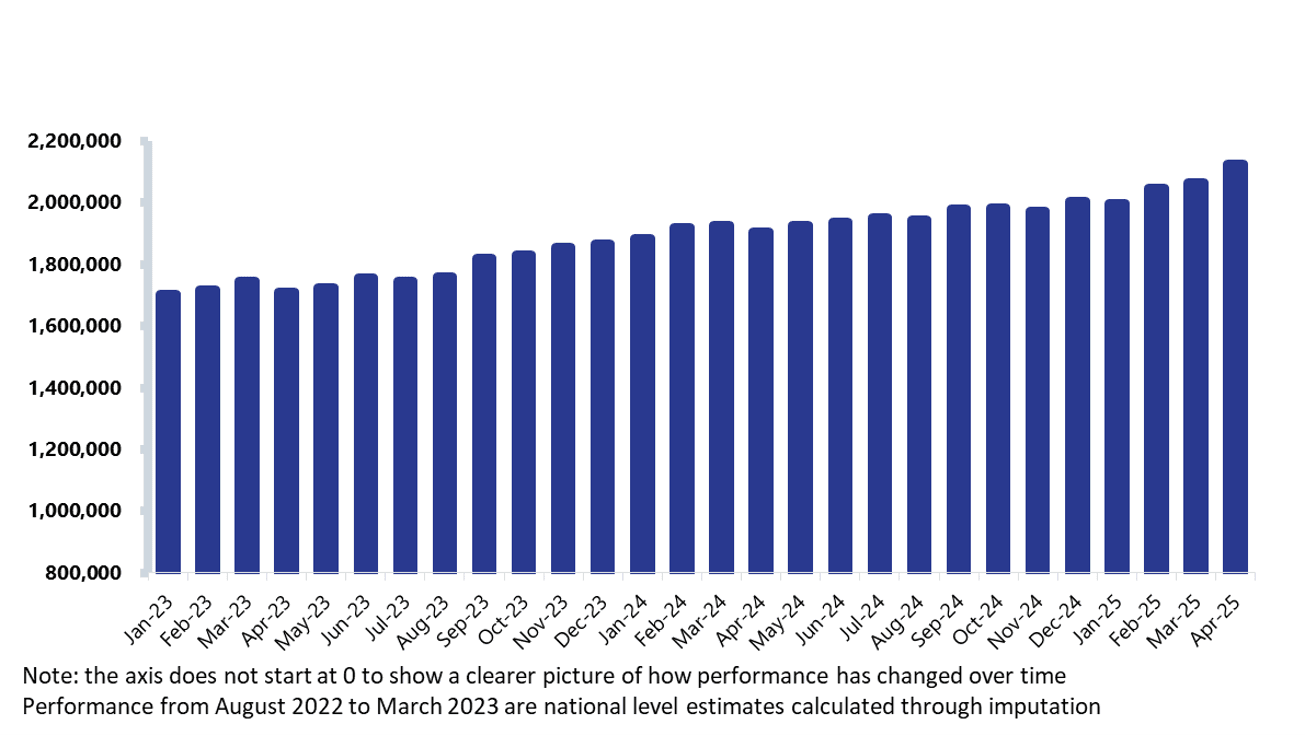 - The number of people in contact with mental health services reached a record high of 2.12 million in April 2025. This represents an 11.5% increase compared to last year and a 57.3% increase compared to pre-pandemic levels.