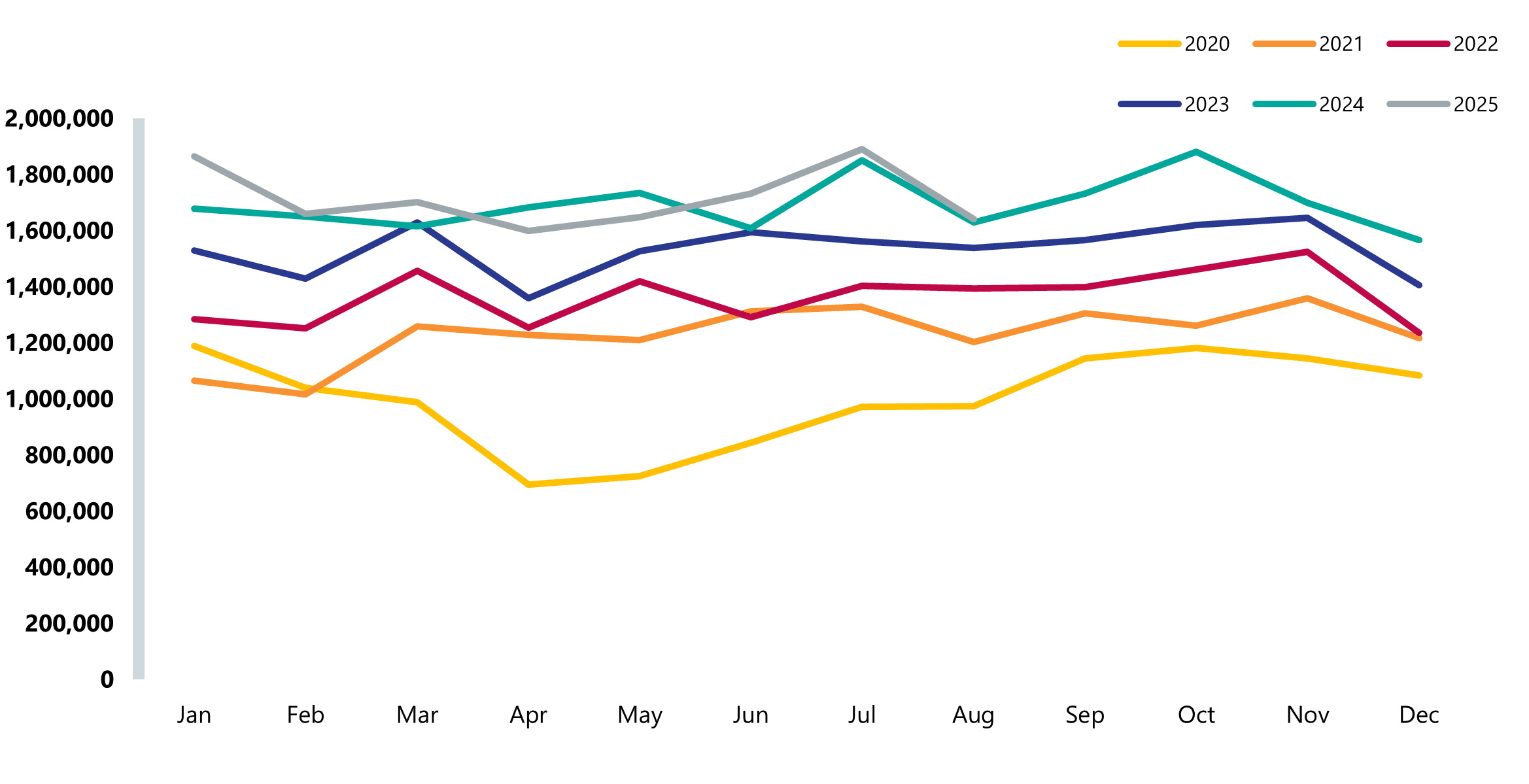 - In August 2025, there were 1.64 million referrals received to community services, broadly in line with last year. Referrals have risen by 50% compared to six years ago, before the pandemic (August 2019).
