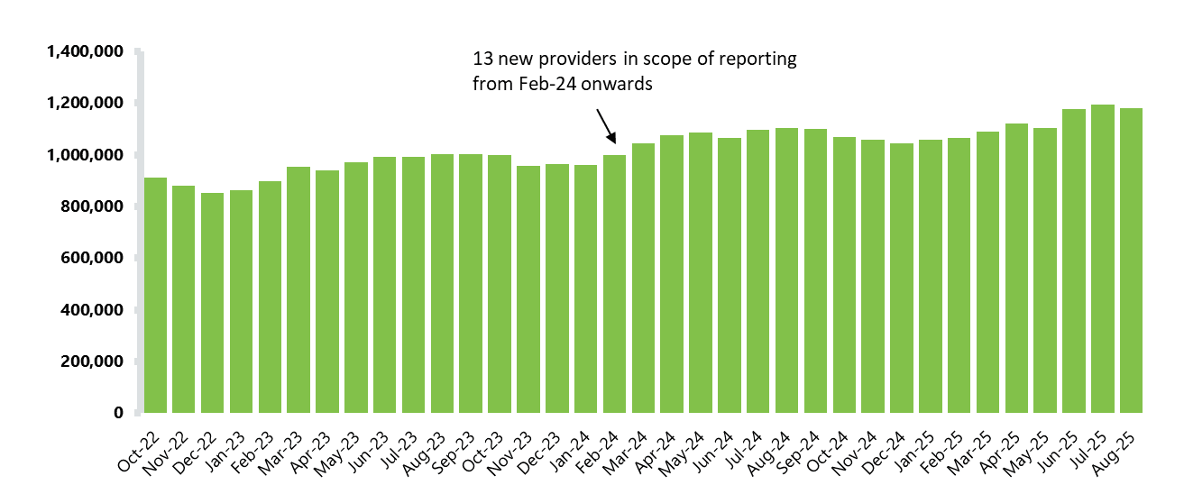 - A total of 9.32 million care contacts were reported across all submitters in July 2025. This is 8% higher than last month but relatively unchanged compared to the same period last year.