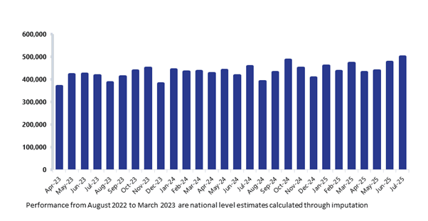 In July 2025, new mental health referrals rose to 499,830. This is the highest number of new referrals recorded in a month. New referrals are up by 9.2% compared to last year and 47.7% higher than six years ago, before the pandemic.