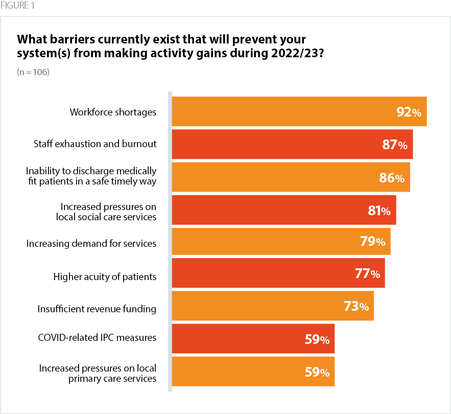 - 79% of respondents said that increasing demand for services was preventing their system from making activity gains during 2022/23.