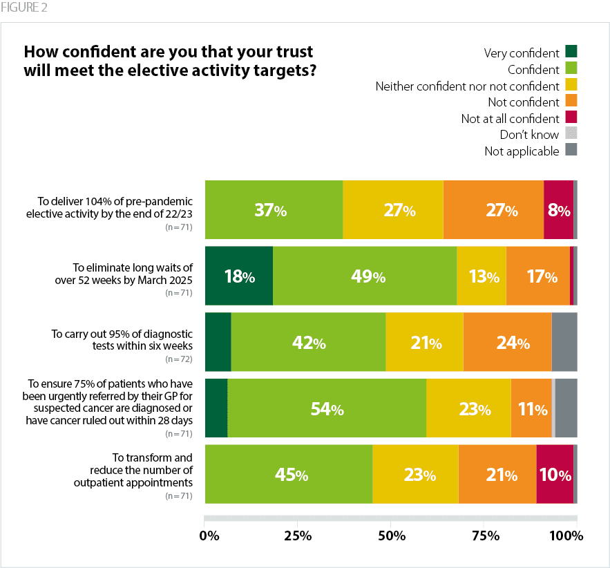 - 42% of respondents from trusts that provide elective care are not at all confident or not confident that they will deliver their recovery targets to reduce long waits in 2022/23.
