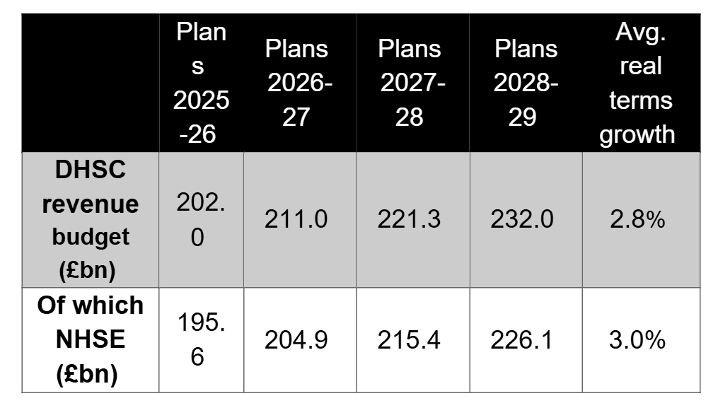 Over the spending review period from 2025/26 to 2028/29, the NHS will receive a 3.0% real terms growth in day-to-day spending, amounting to a £29bn increase in annual resource budgets. By the end of the spending review period, the resource departmental expenditure limit (RDEL) for DHSC will peak at £232bn.