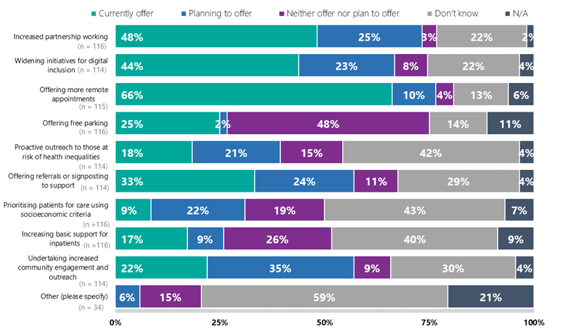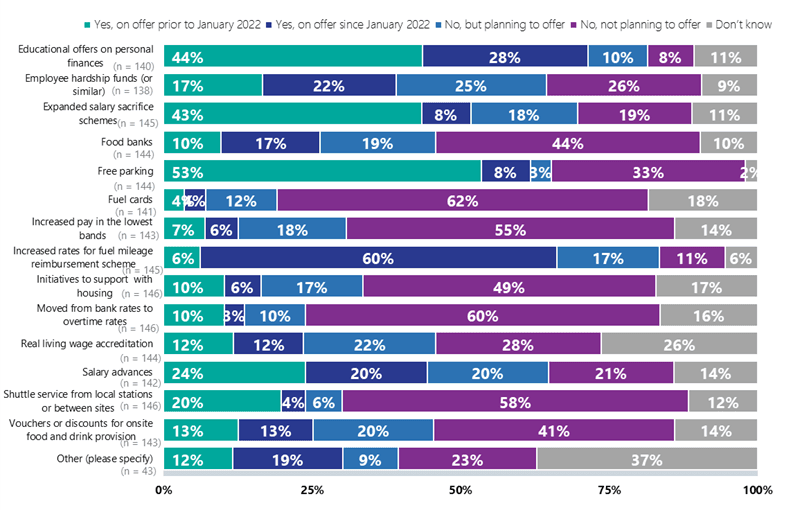 Alongside this, trusts are stepping up support for staff. Three quarters (72%) offer financial advice and education, with 10% more planning to introduce this service. Others are offering direct support, including food banks (27% offering, with 19% planning to do so). While trusts were already supporting staff in a variety of ways, many more have introduced these measures this year in direct response to the rising cost of living and are seeing increases in take-up and requests for further support.