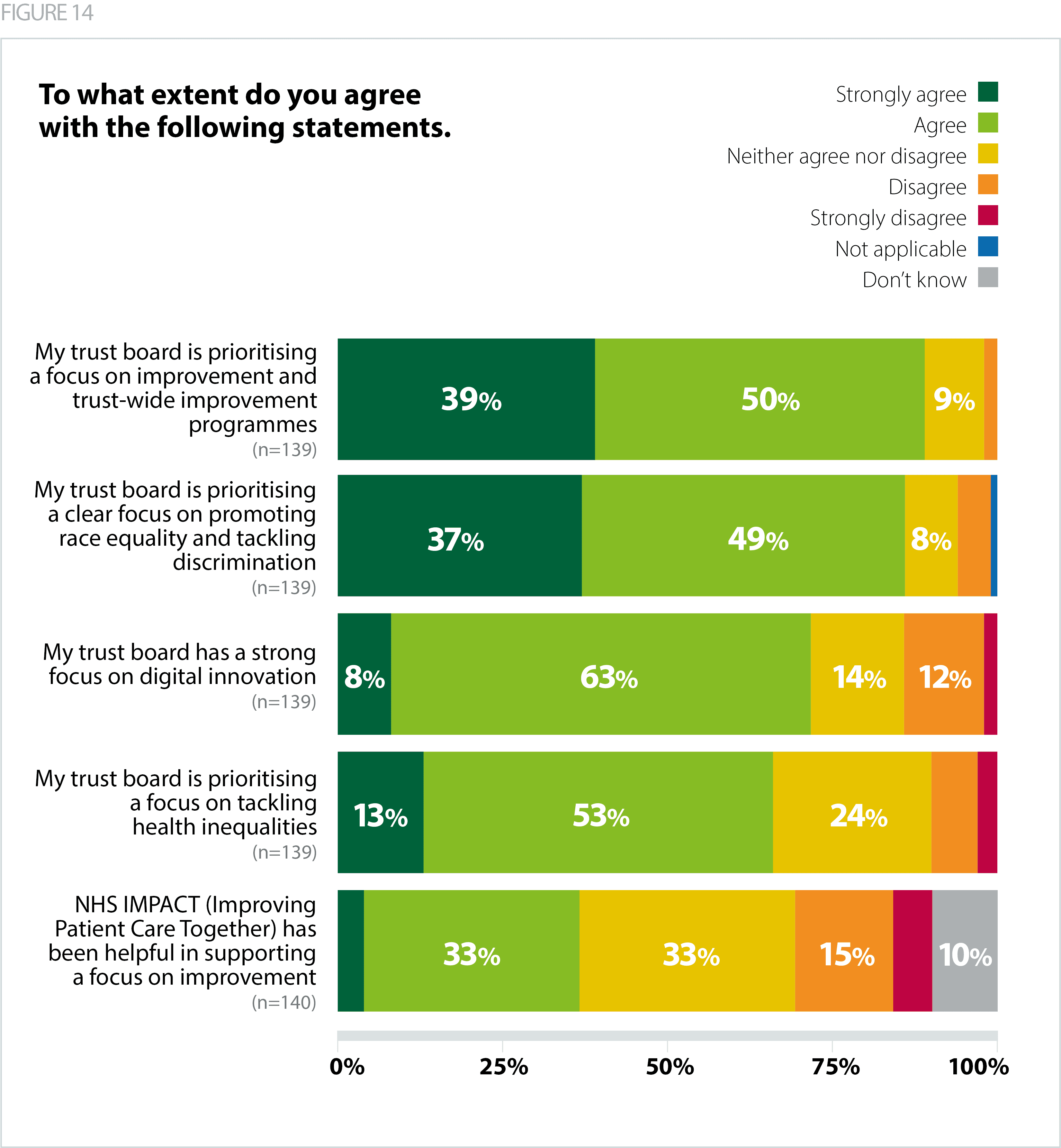 - Nearly nine in 10 trust leaders (89%) strongly agreed (39%) or agreed (50%) that their trust is prioritising quality improvement and trust-wide improvement programmes. Over eight in 10 respondents (86%) strongly agreed (37%) or agreed (49%) that their trust board is prioritising a clear focus on promoting race equality and tackling discrimination. Almost three quarters (71%) strongly agreed (8%) or agreed (63%) that their trust board has a strong focus on digital innovation.
