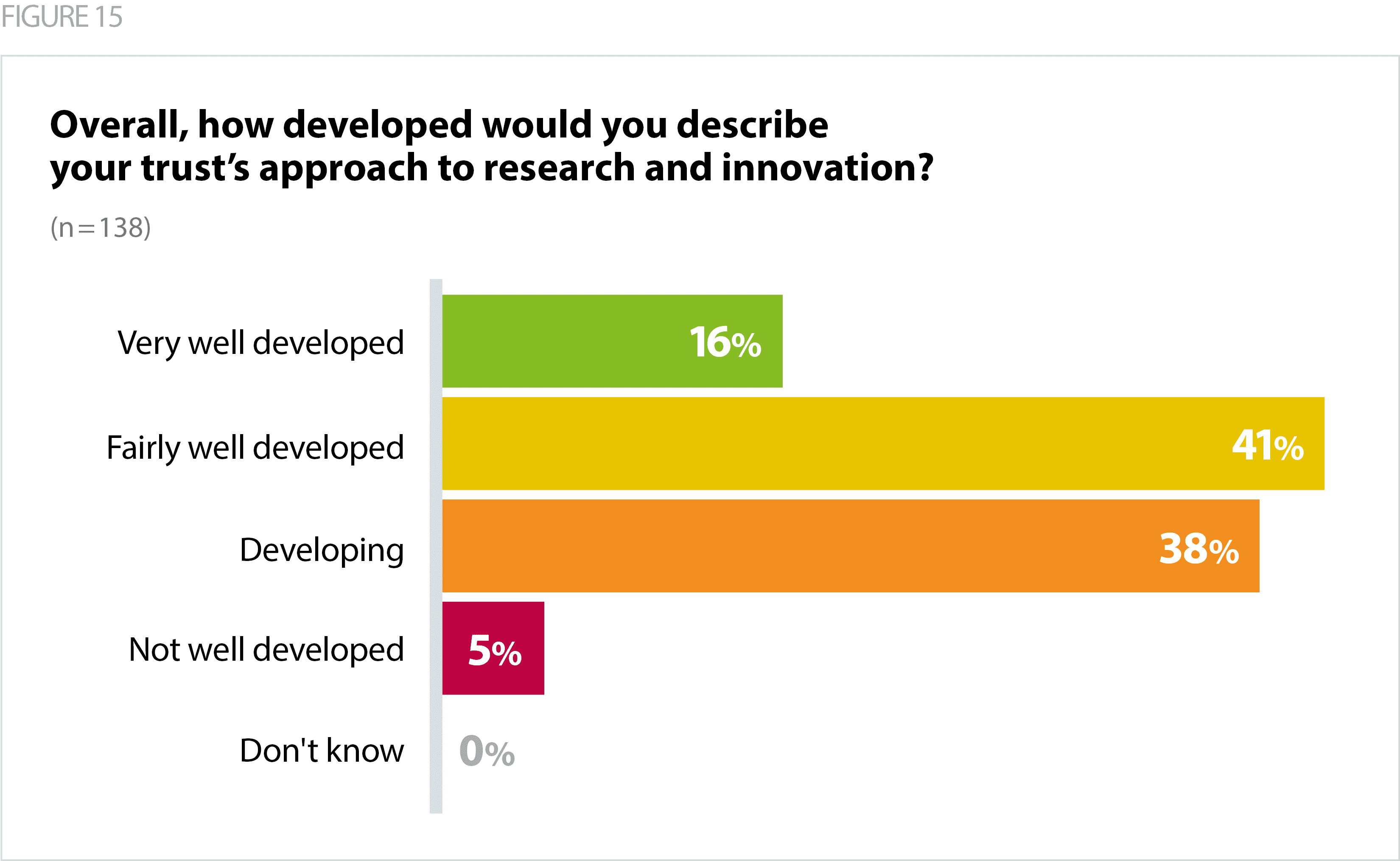 - Over half of respondents (57%) said they would describe their trust’s approach to research and innovation as very well (16%) or fairly (41%) developed. 38% said their trust’s approach to research and innovation was developing and 5% said it is not well developed.