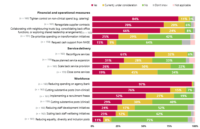 - Workforce: 97% of trust leaders are cutting agency and bank spend. Many are reducing non-clinical posts (76%) but cuts to substantive posts are less common (29%). Over half are implementing recruitment freezes (52%).