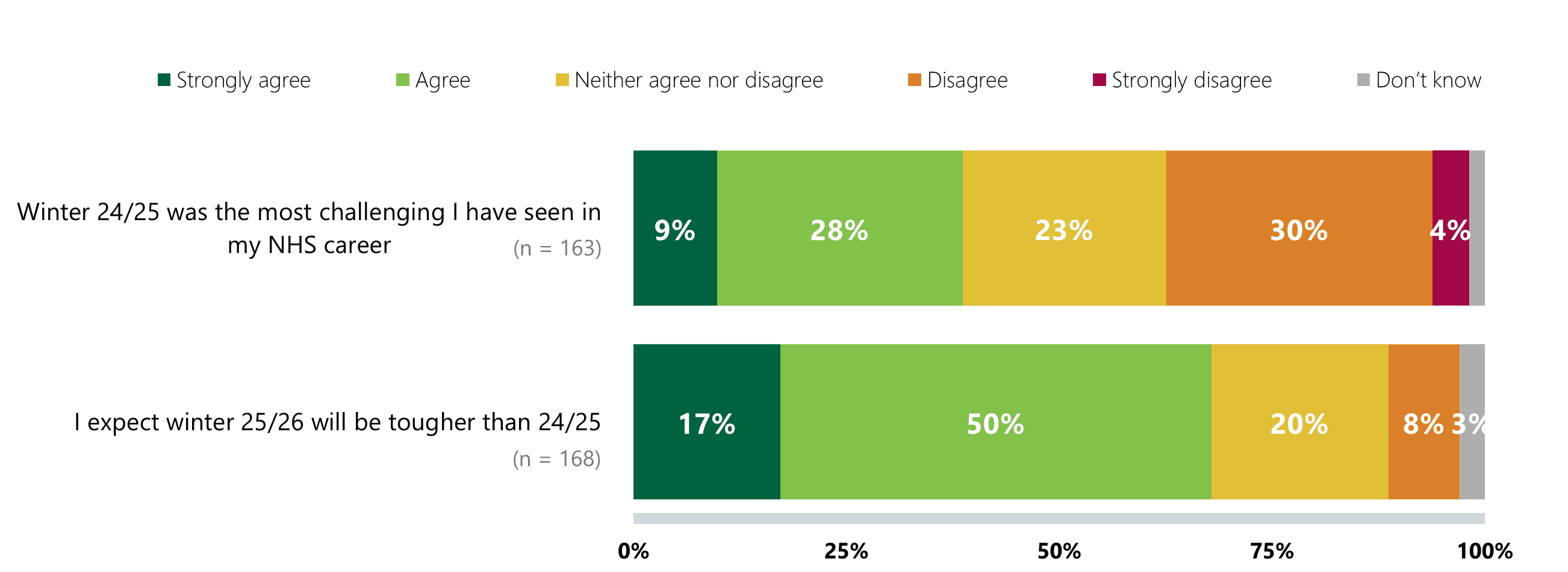 - 37% of respondents strongly agreed (9%) or agreed (28%) that last winter was the most challenging of their NHS career, down from 41% last year.