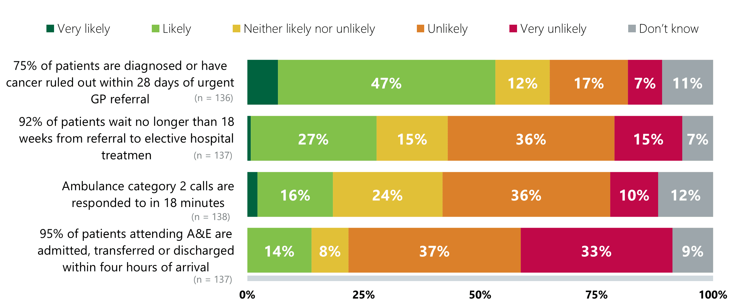 - Around half of respondents felt that it was unlikely that 92% of patients wait no longer than 18 weeks from referral to elective hospital treatment or that ambulance category 2 calls are responded to in 18 minutes in the next five years (50% and 46% unlikely, respectively).