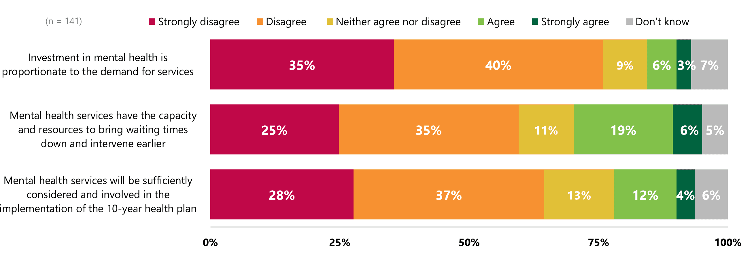 - Only 9% of those surveyed agreed that investment in mental health is proportionate to the demand for services, while three quarters (76%) disagree.