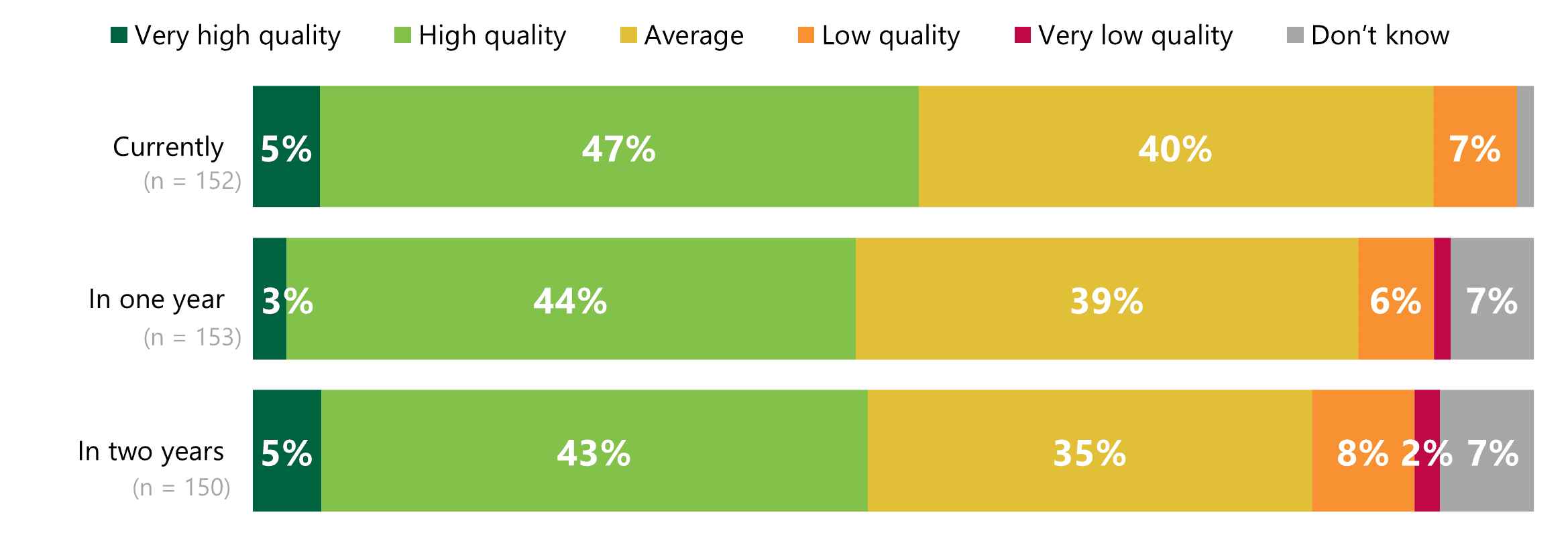 - Almost half (48%) of trust leaders felt that the quality of healthcare provided by their local area in the coming two years would be very high (5%) or high (43%), up from 35% last year.