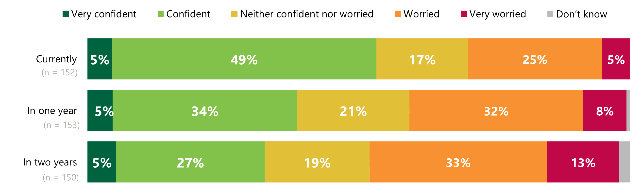 - Confidence declines for one years’ time (39%), though it's improved since last year (25%). 40% were worried, which is down from 50% last year.