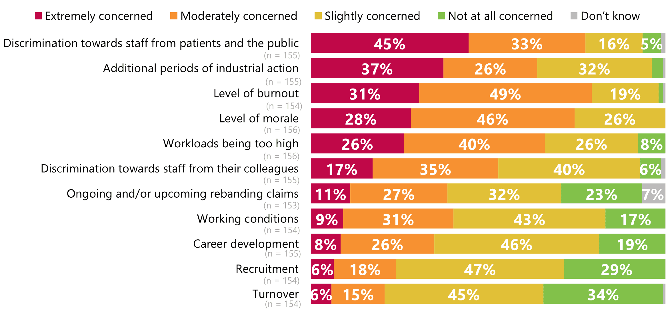 - Trust leaders have high levels of moderate to extreme concern about burnout (79%), and discrimination towards staff from patients and the public (77%), and morale (74%).
