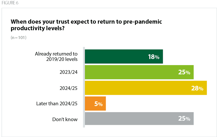As our survey results suggest, nearly a fifth of trusts have already returned to pre-pandemic productivity levels, and over half expect to return to pre-pandemic levels by the end of 2024/25 in addition to making impressive performance gains in certain areas as set out in the previous section. However, despite providers continuing to drive up activity levels, productivity is below pre-pandemic levels.