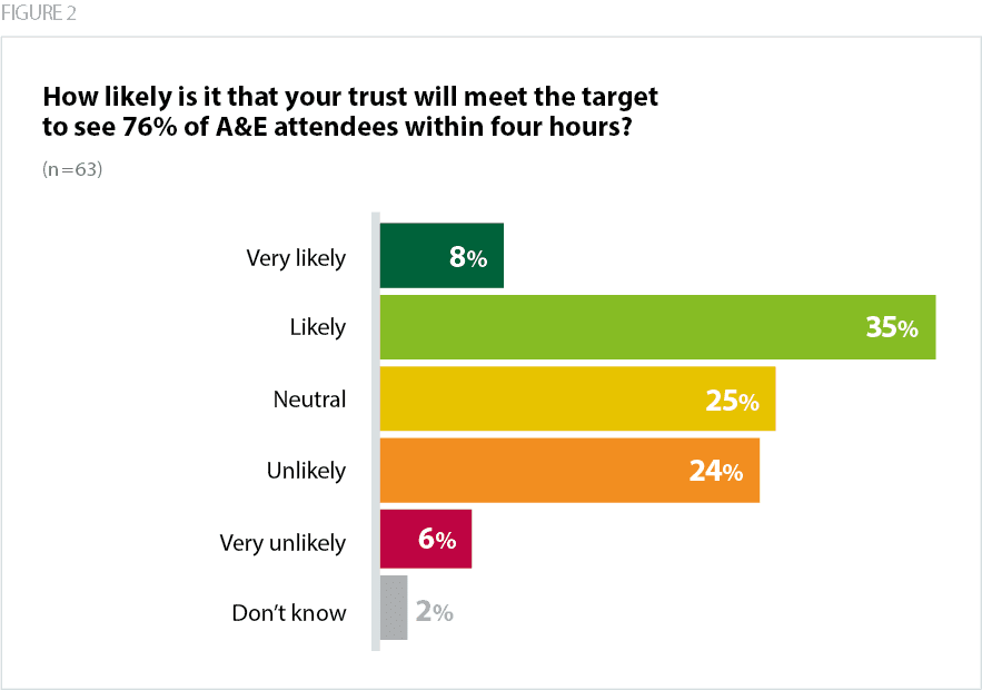 During the winter of 2022/23 performance against the four-hour target hit a record low of 65% (NHS England, 2023e). While the first months of 2023 saw performance improve, this will be a challenging target to achieve, as demand remains high and capacity too low. This is reflected in the fact that fewer than half (43%) of our survey respondents were confident of achieving the target.