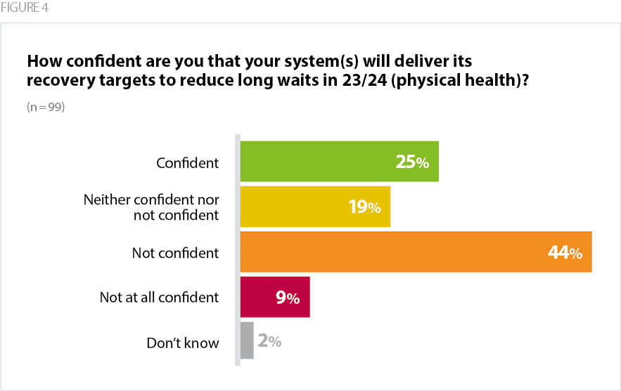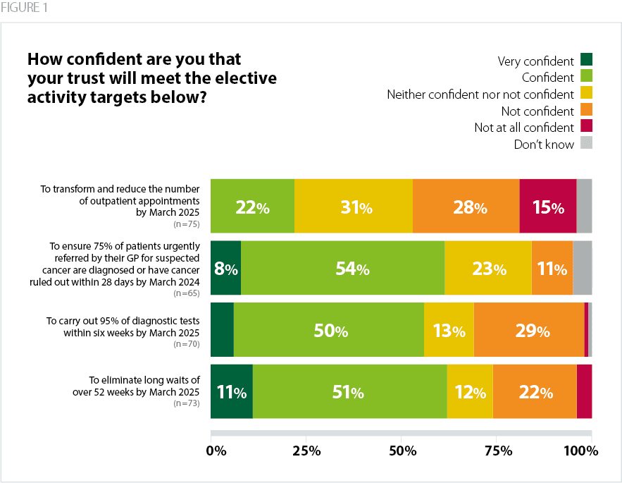 The next milestone in the elective recovery plan is to virtually eliminate 52-week waits by March 2025. Two thirds (62%) of respondents to our survey said they were confident or very confident of hitting this target.